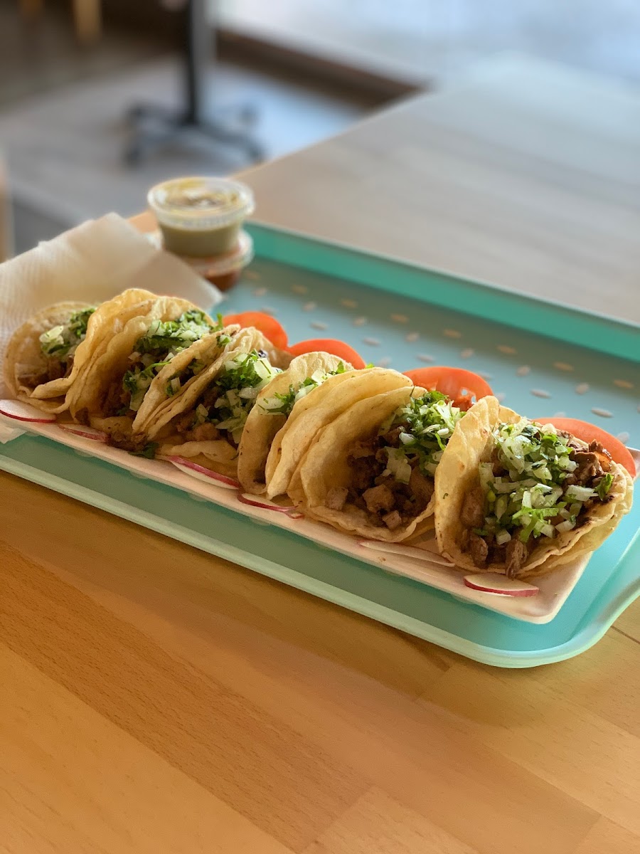 Beef tacos topped with cilantro and onion